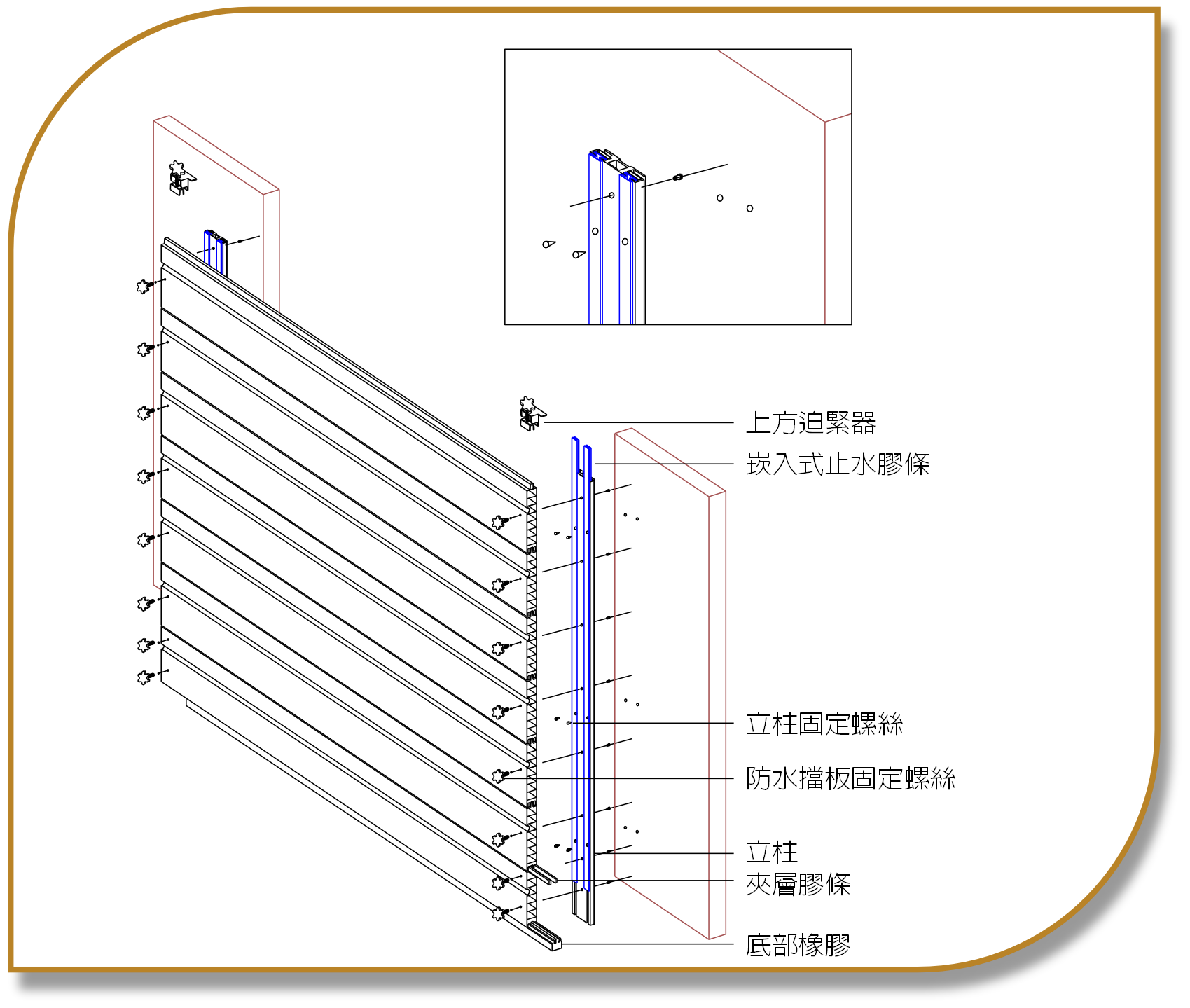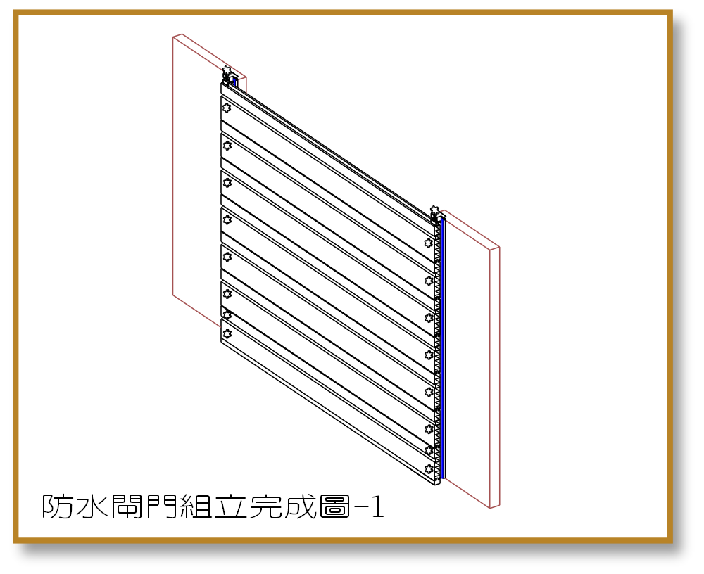 | 組裝方式 | 插板式防水閘門,先將9片閘板(單片長600m)總高度為153cm, 安裝於兩側側柱,再於閘門外側加上四支三角形斜支撐桿使成五等份, 寬度為120cm,增加閘門抗壓強度‘扇形雙開式閘門, 為將閘門固定於兩側柱子,可以自由開起,關閉後再加以扣緊, 可以達到密封效果,中間加上一支三角形斜支撐桿。 |